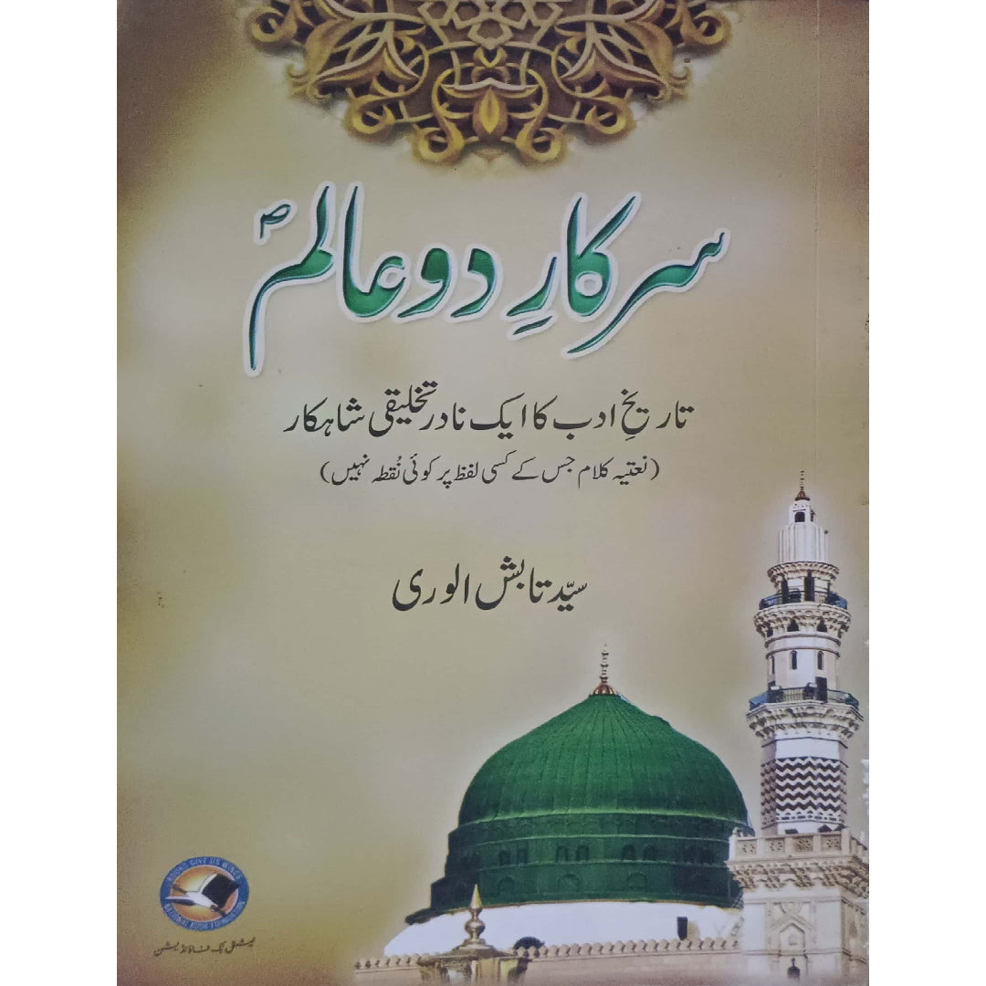 The image shows the cover of a book titled "Sarkar-e-Do Alam" (سَرکار دو عالم). The text below the title translates to "A unique creative masterpiece of the history of literature (Naat poetry in which no word has any dots)." The author is named Syed Tabish Alwari. "Sarkar-e-Do Alam" translates to "Leader of both worlds," often used as a title for the Prophet Muhammad in Islamic contexts. The book cover also features an image of the Masjid al-Nabawi in Medina, with its distinctive green dome and minarets. The text on the bottom right corner appears to be the publisher's information in Urdu. The book's description indicates that it is a collection of Naat poetry, a genre of poetry that praises the Prophet Muhammad, and it is unique in that none of the words used have any diacritical marks (dots).